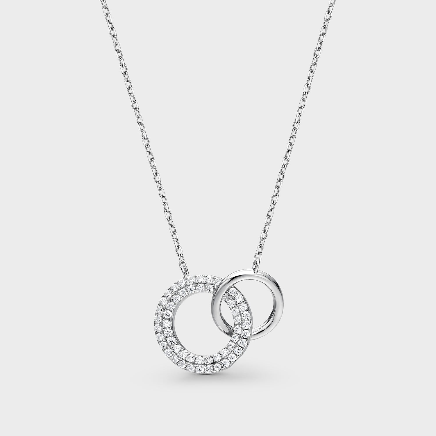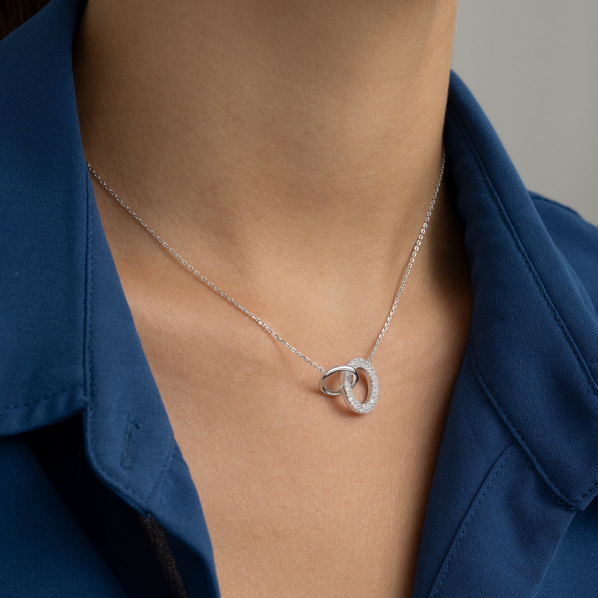 Collar en Plata de Ley 925 y circonitas con un círculo grande pavé y otro círculo más pequeño liso, ambos entrelazados.