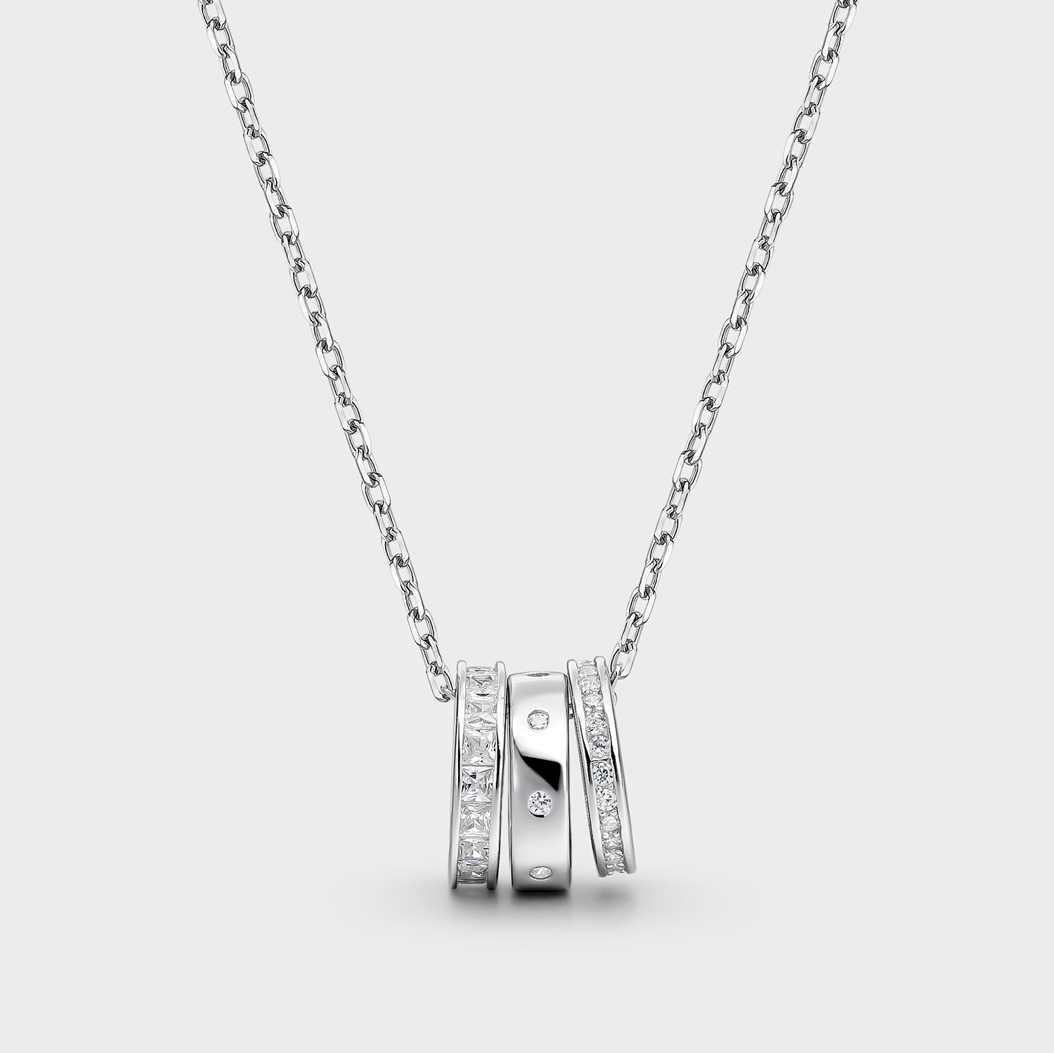Collar en Plata de Ley 925 con tres anillos como colgantes, con circonitas dispuestas y en pavé.