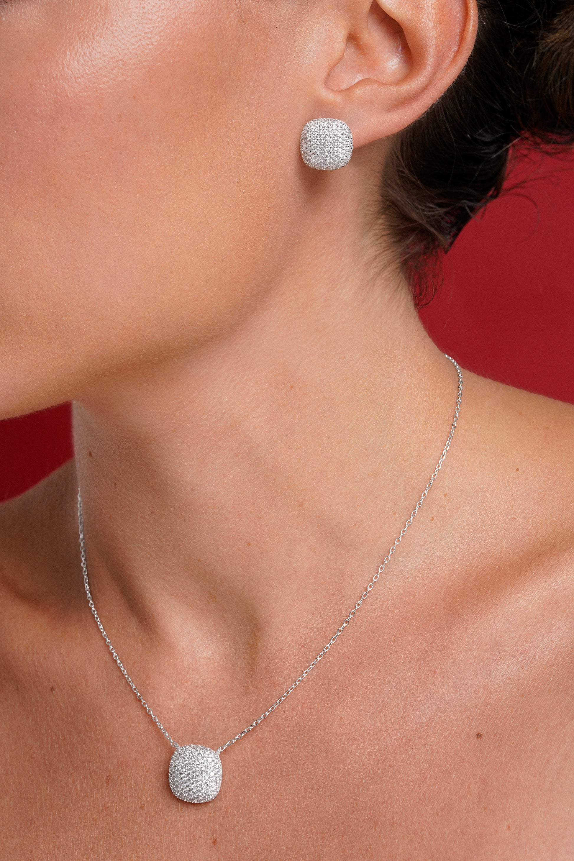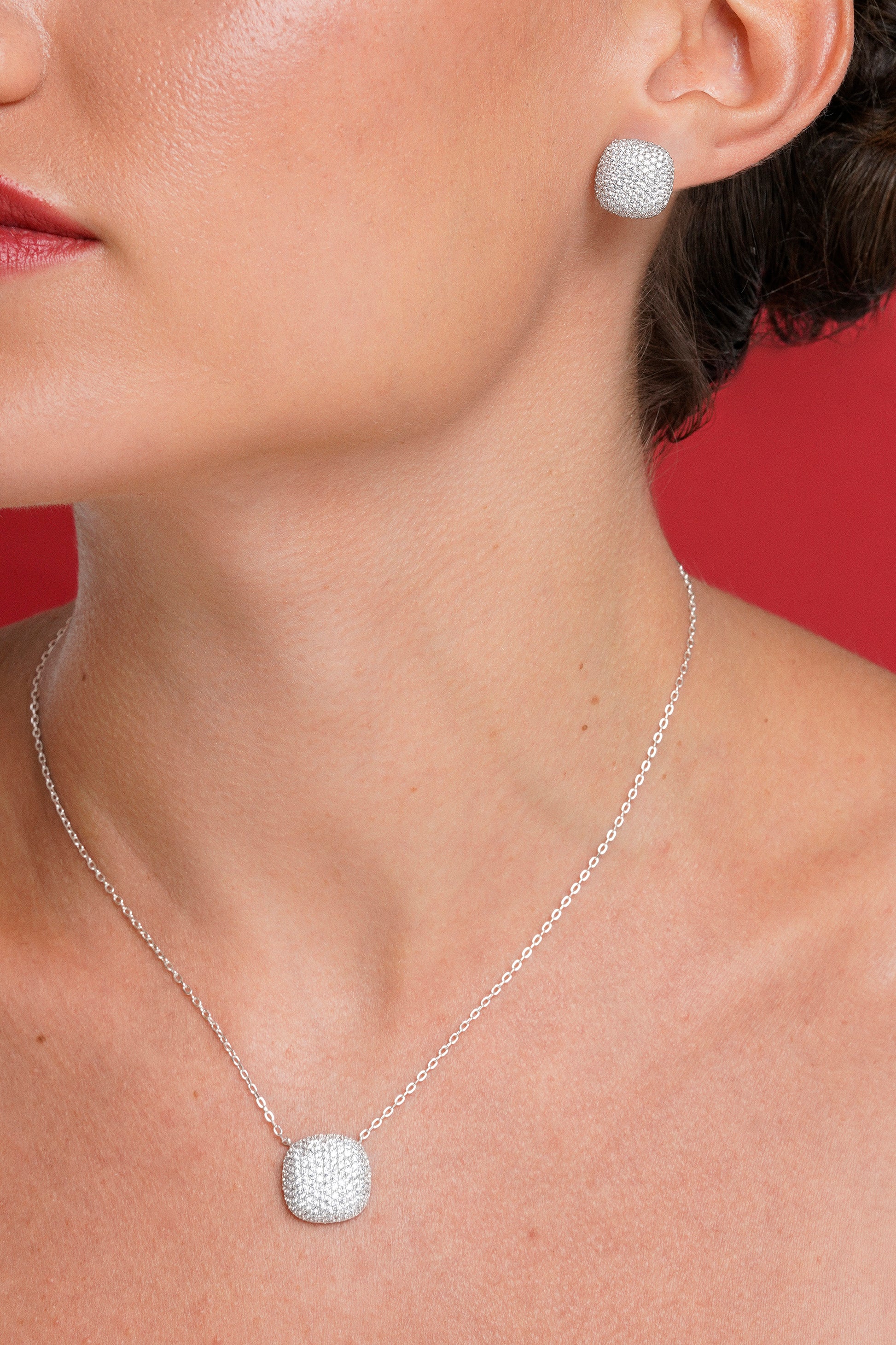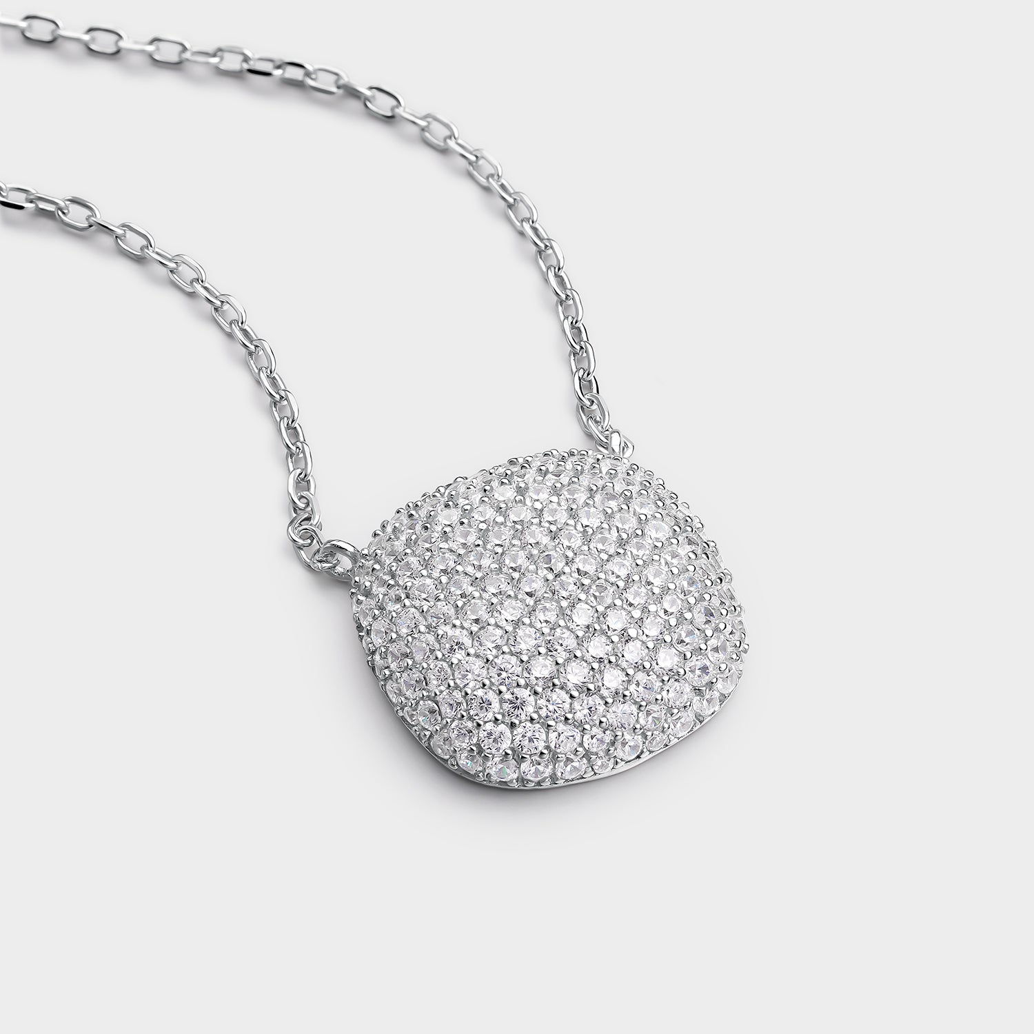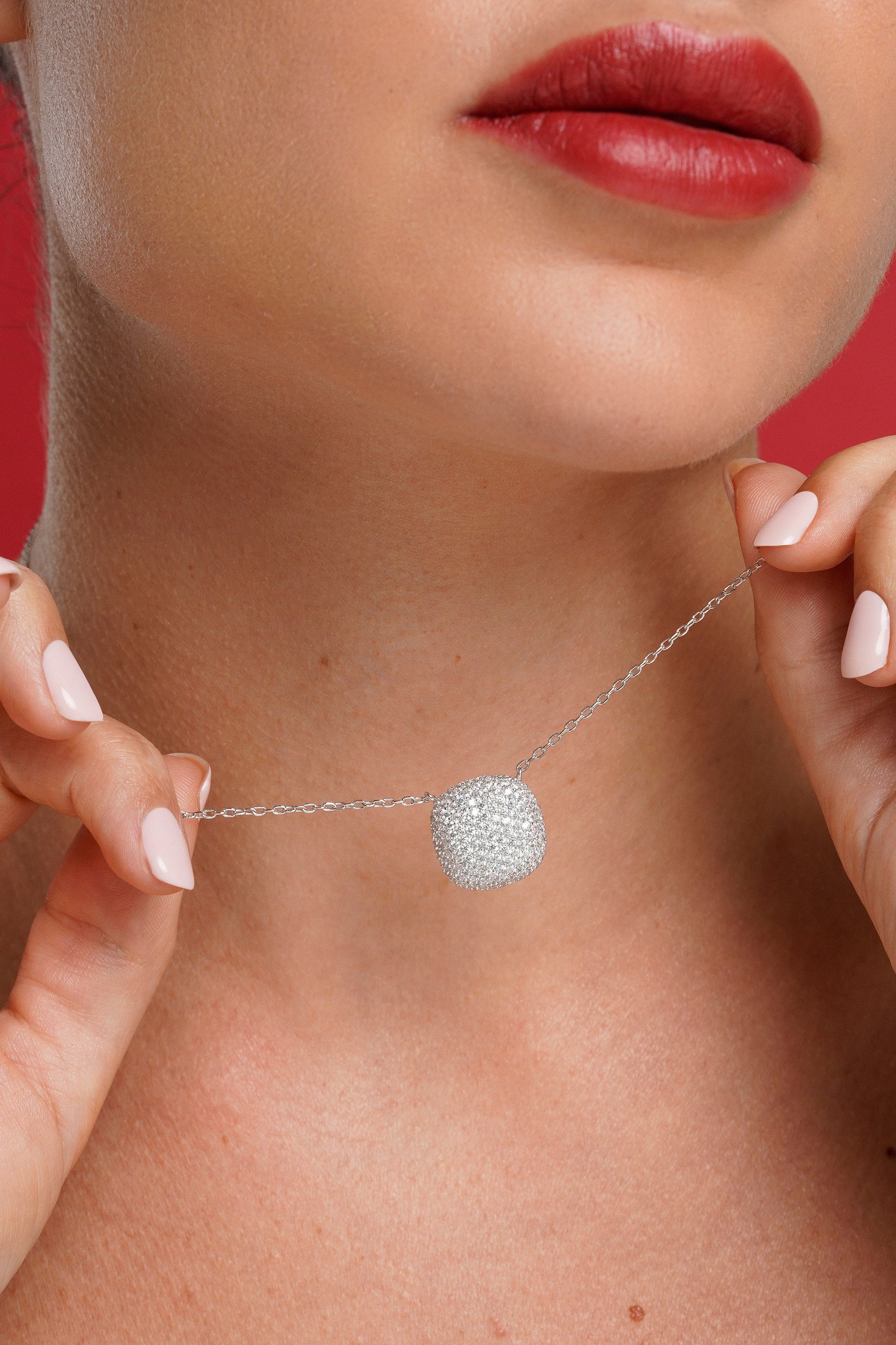 La técnica PAVÉ, como su nombre indica (pavimento), consiste en engastar pequeñas piedras de una joya, una al lado de la otra, formando filas infinitas. Esta disposición, realizada de forma completamente MANUAL, consigue que la pieza brille al máximo. Enamórate de este collar en forma cushion.