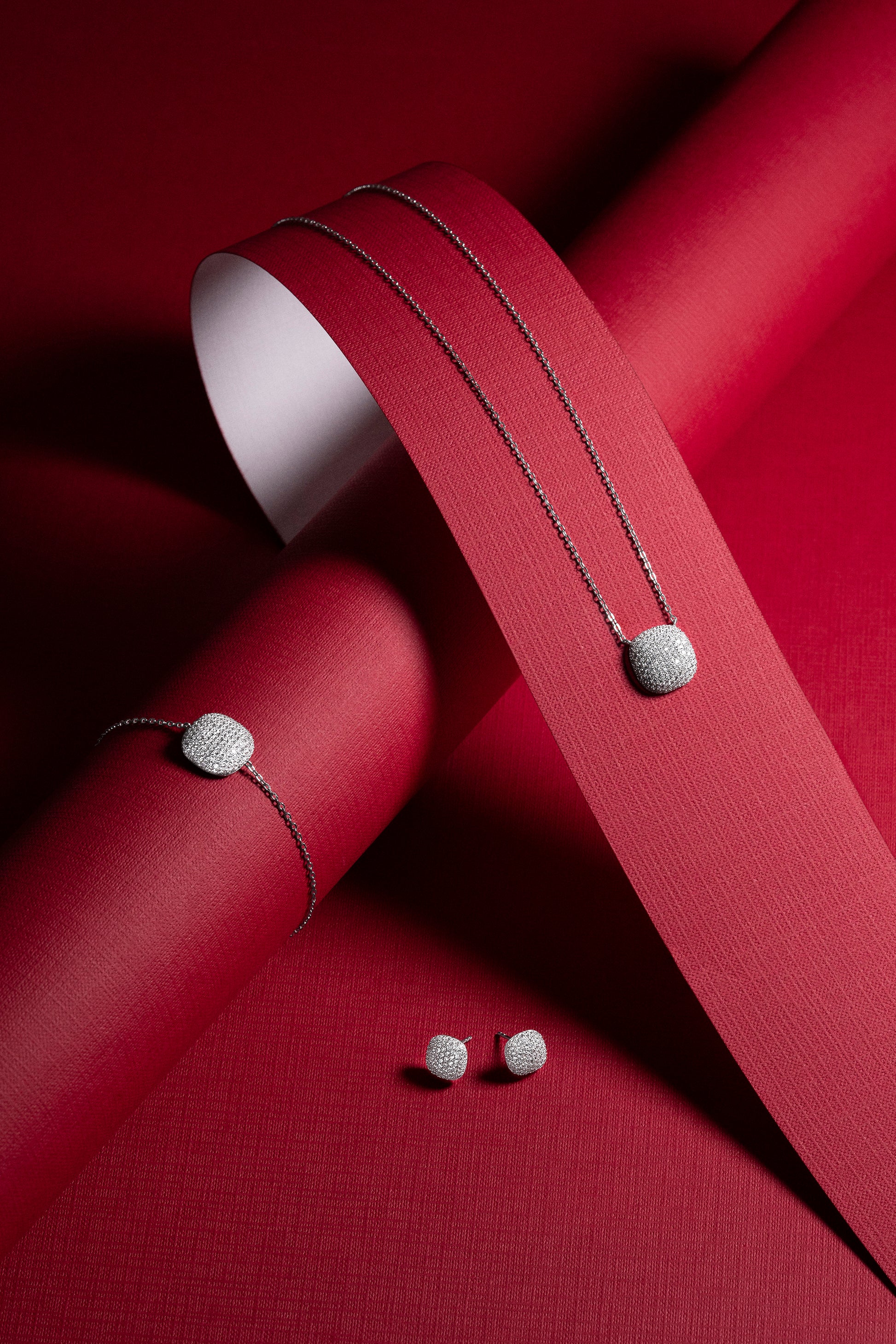 La técnica PAVÉ, como su nombre indica (pavimento), consiste en engastar pequeñas piedras de una joya, una al lado de la otra, formando filas infinitas. Esta disposición, realizada de forma completamente MANUAL, consigue que la pieza brille al máximo.