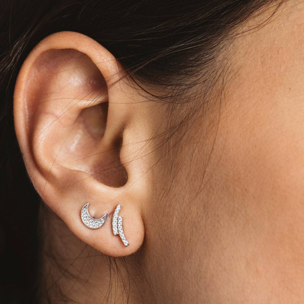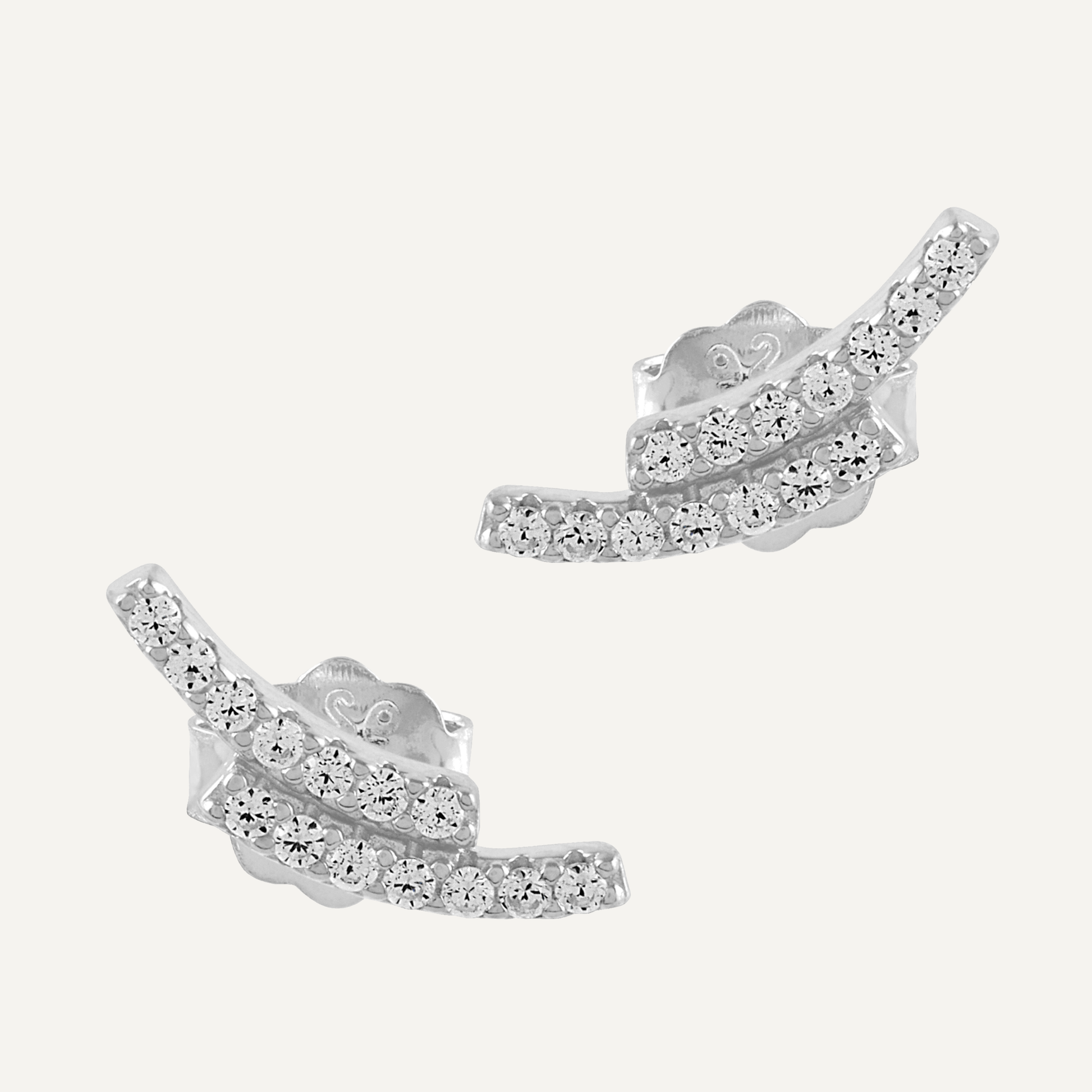 The Two Stelas Silver Earrings with Zircons are an elegant and sophisticated jewel. They are made of sterling silver and feature two intertwined curved lines, creating a unique design. The white zircons embedded in each line provide exceptional shine. Perfect for any occasion, its snap closure guarantees a comfortable fit. A special gift that will never go out of style and will always be appreciated.