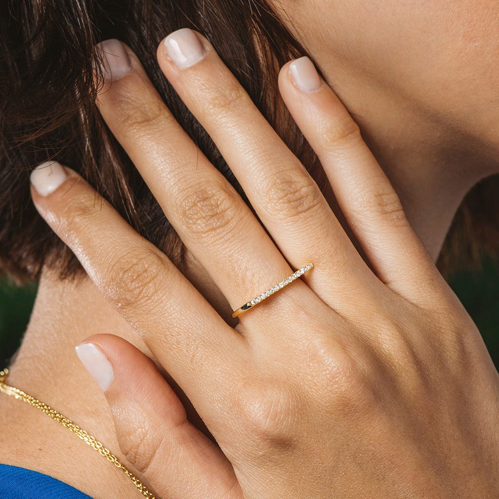 Este elegante anillo de plata bañada en oro amarillo es una pieza única que no puede faltar en tu colección de joyas. Su diseño minimalista y moderno lo convierte en un accesorio perfecto para cualquier ocasión. El motivo de línea horizontal con circonitas blancas le da un toque de brillo y sofisticación, mientras que su alta calidad y durabilidad garantizan su seguridad. ¡Una elección perfecta para un anillo elegante y sofisticado!