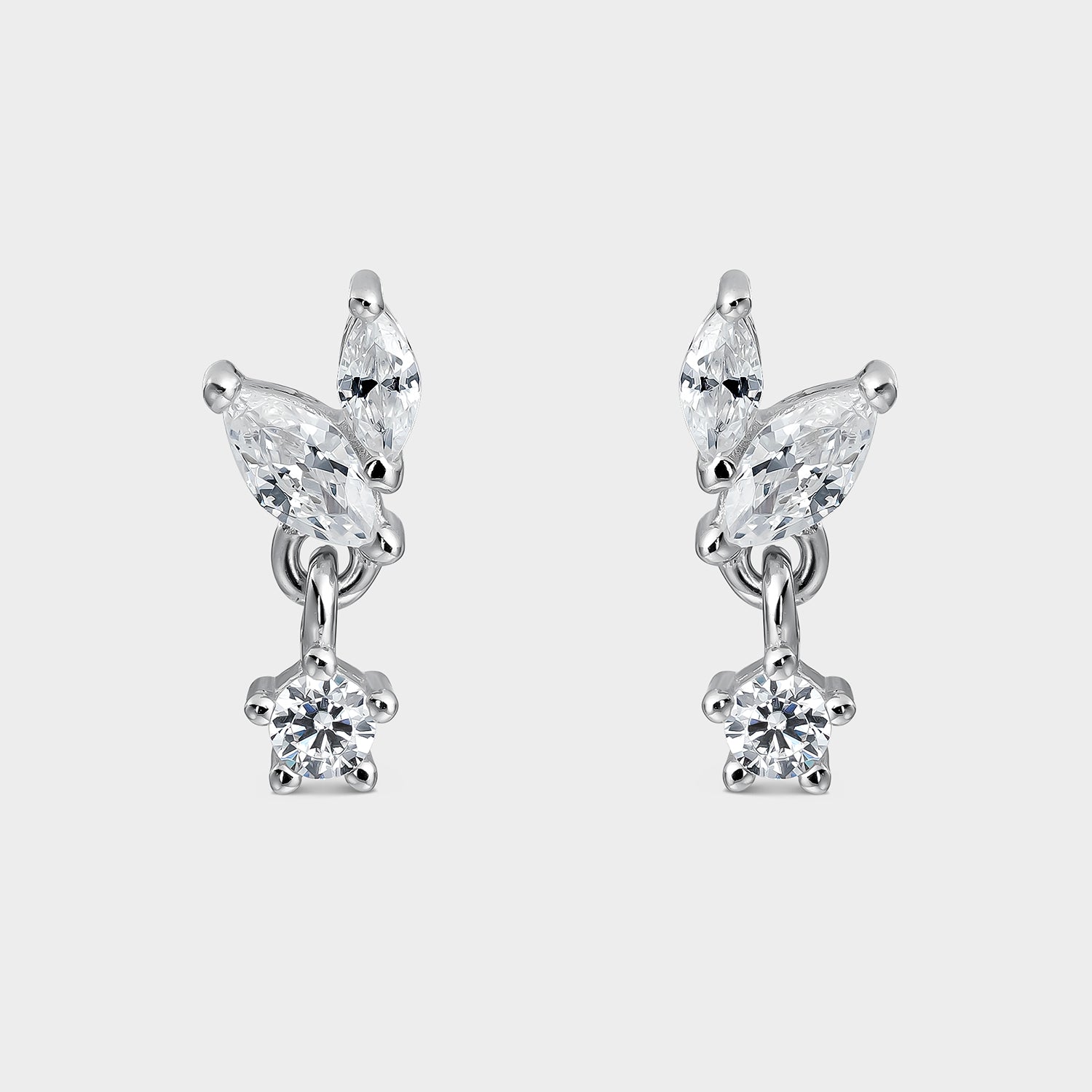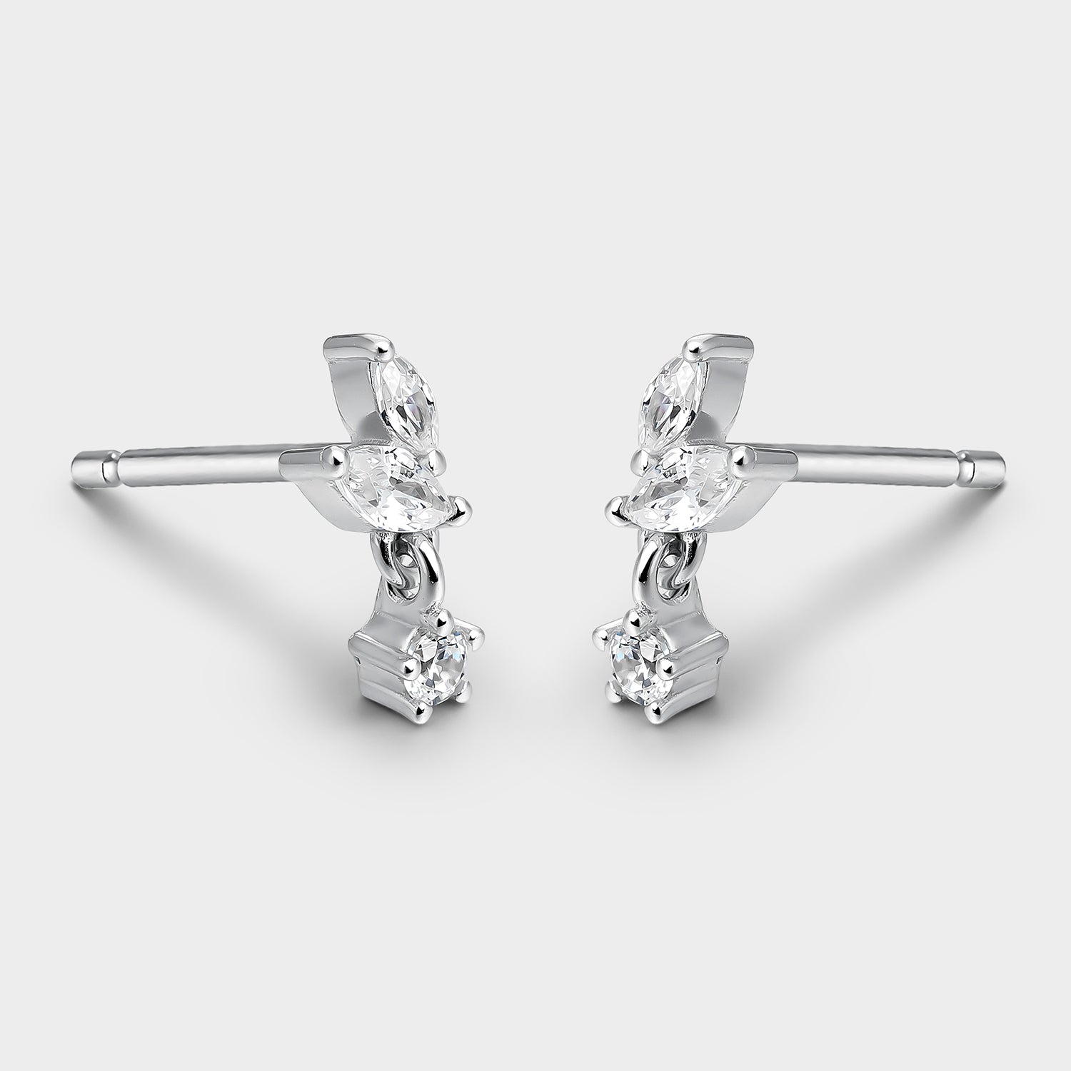 Pendientes en Plata de Ley 925 y circonitas con forma de hojitas y pequeños colgantes.