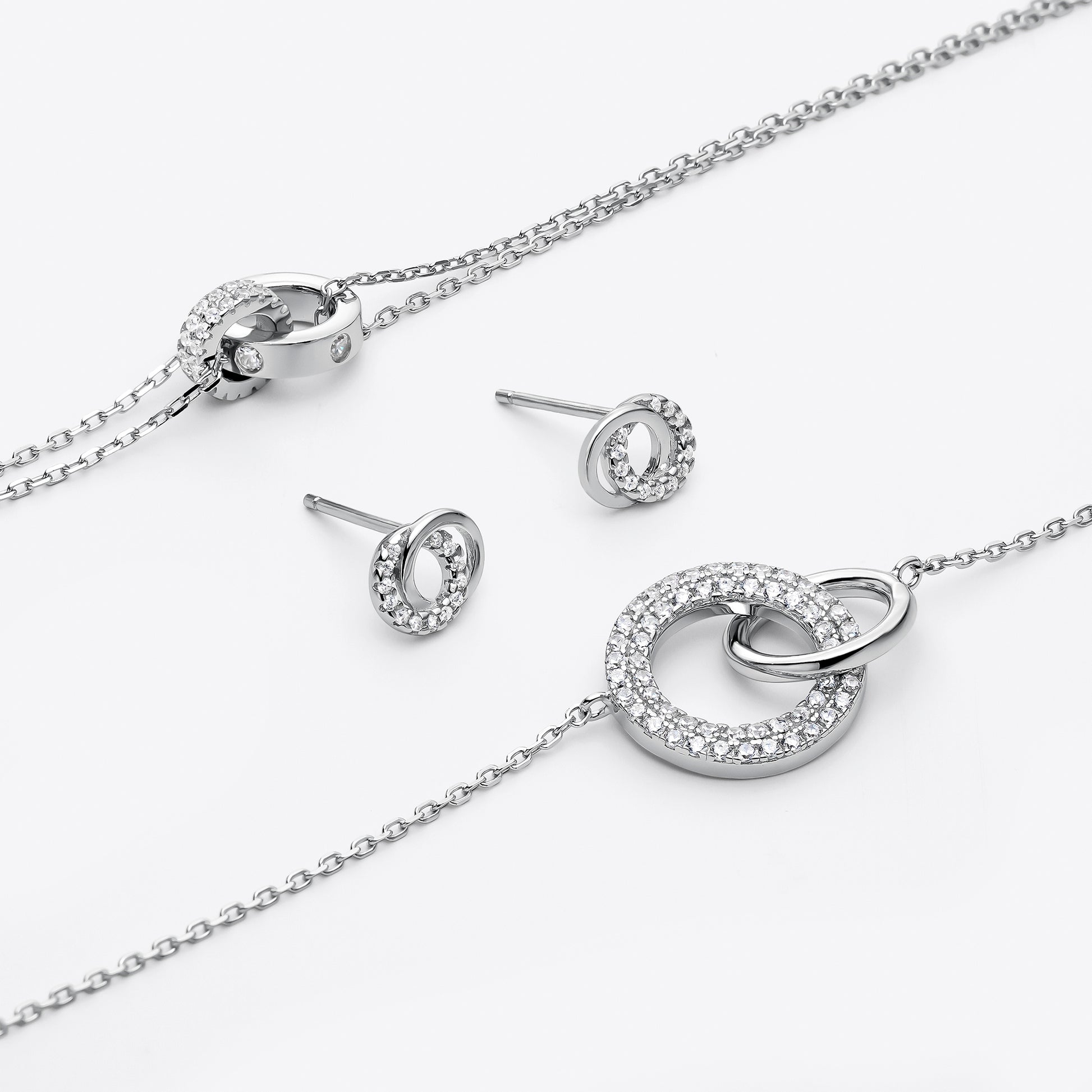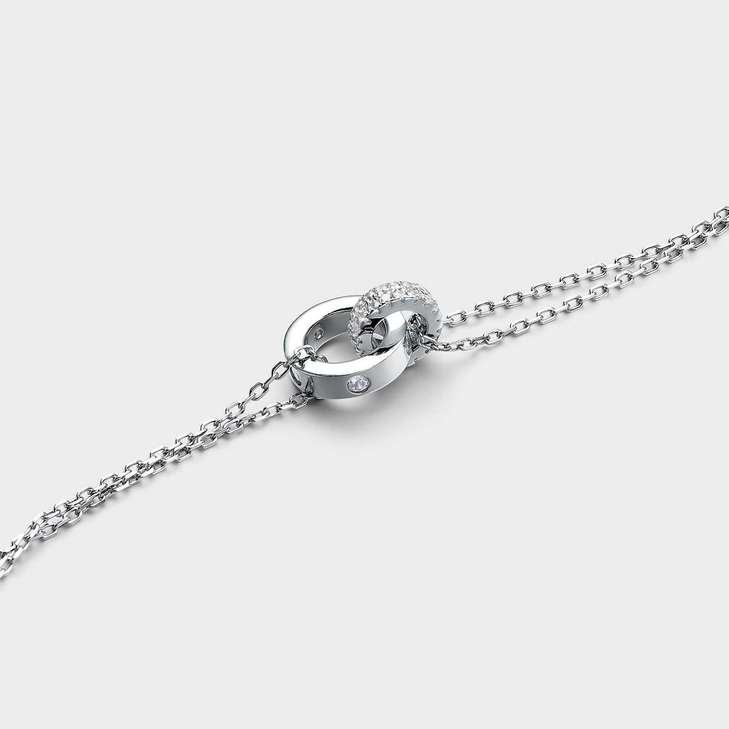 Pulsera Plata de Ley 925 y circonitas en un círculo pavé y otro círculo liso entrelazados.